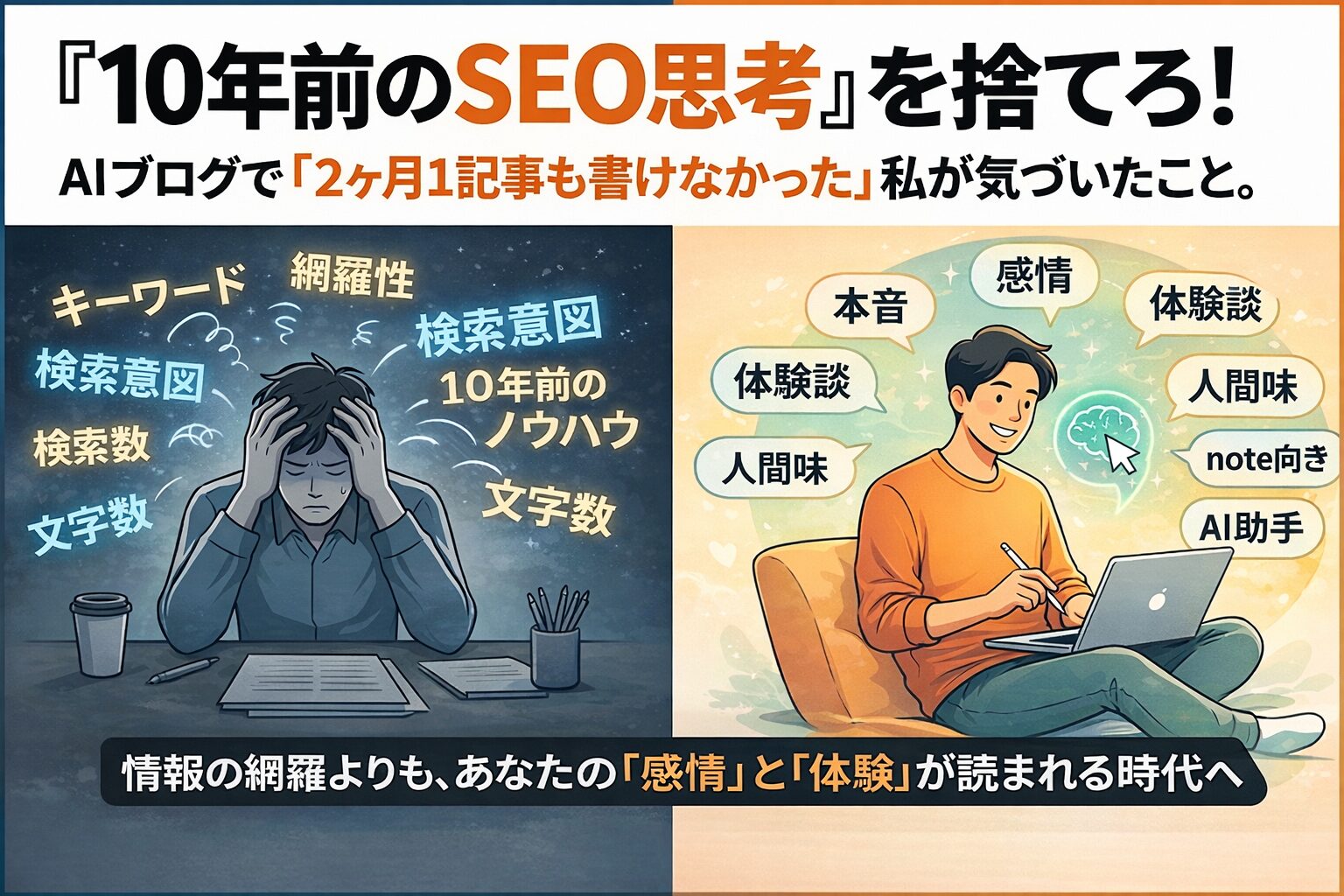 Googleに評価されるための、機械的な書き方である。頭にそれが染み付いていたので、「正しい書き方」に切り替えられなかった。「キーワードを入れなきゃ」「もっと網羅しなきゃ」という癖が、常に邪魔をしていた。